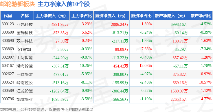 从资金流向上来看,当日邮轮游艇板块主力资金净流出2.65亿元,游资资金净流入1374.31万元,散户资金净流入2.51亿元。邮轮游艇板块个股资金流向见下表: