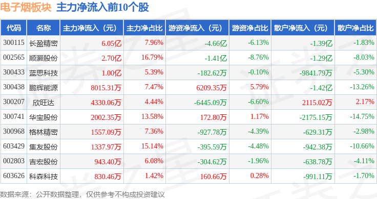 从资金流向上来看,当日电子烟板块主力资金净流出13.23亿元,游资资金净流入8772.53万元,散户资金净流入12.36亿元。电子烟板块个股资金流向见下表: