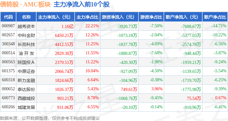 从资金流向上来看,当日债转股 · AMC板块主力资金净流入1.34亿元,游资资金净流出1.1亿元,散户资金净流出2476.47万元。债转股 · AMC板块个股资金流向见下表: