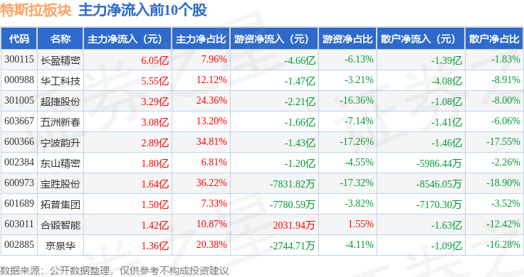 从资金流向上来看,当日特斯拉板块主力资金净流入6.05亿元,游资资金净流出19.08亿元,散户资金净流入13.03亿元。特斯拉板块个股资金流向见下表:
