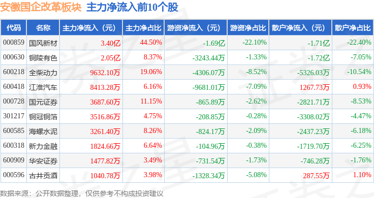 从资金流向上来看,当日安徽国企改革板块主力资金净流入5.68亿元,游资资金净流出3.81亿元,散户资金净流出1.86亿元。安徽国企改革板块个股资金流向见下表: