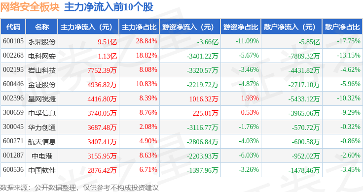 从资金流向上来看,当日网络安全板块主力资金净流出6.55亿元,游资资金净流出5.51亿元,散户资金净流入12.06亿元。网络安全板块个股资金流向见下表: