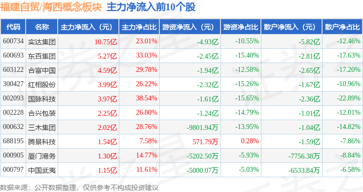 从资金流向上来看,当日福建自贸/海西概念板块主力资金净流入30.96亿元,游资资金净流出16.87亿元,散户资金净流出14.08亿元。福建自贸/海西概念板块个股资金流向见下表: