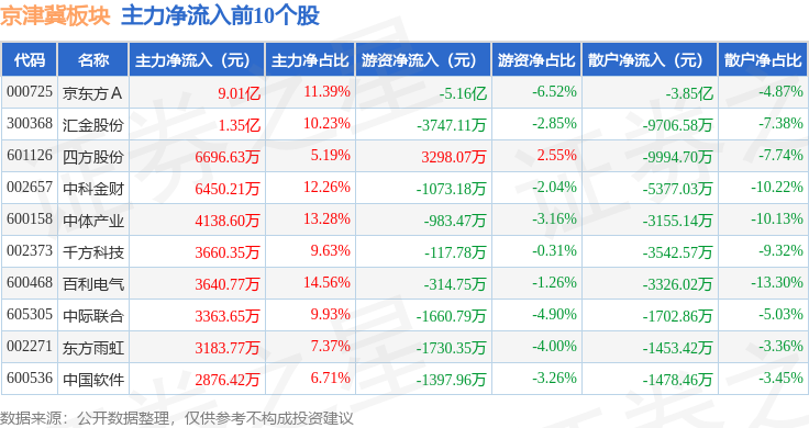 从资金流向上来看,当日京津冀板块主力资金净流入6.12亿元,游资资金净流出8.24亿元,散户资金净流入2.12亿元。京津冀板块个股资金流向见下表: