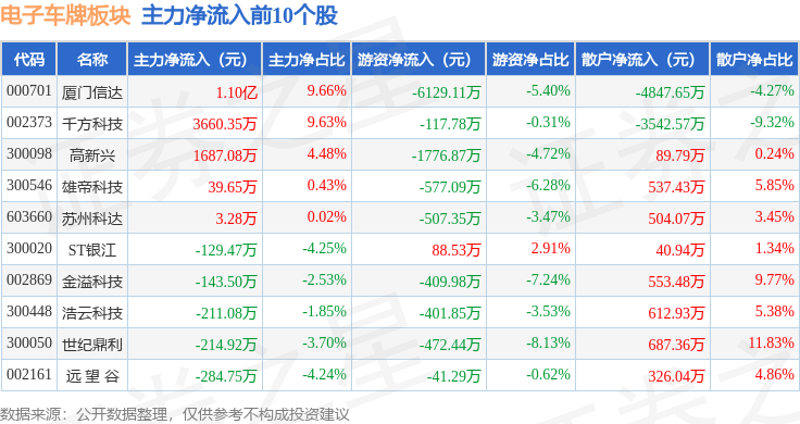 从资金流向上来看,当日电子车牌板块主力资金净流入7971.75万元,游资资金净流出8338.29万元,散户资金净流入366.54万元。电子车牌板块个股资金流向见下表: