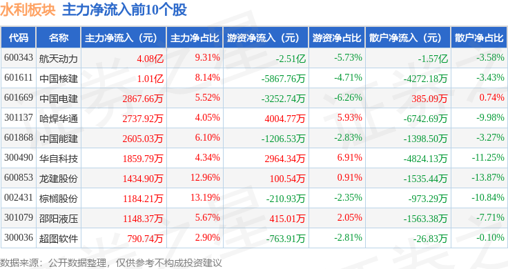 从资金流向上来看,当日水利板块主力资金净流入2653.31万元,游资资金净流出2.34亿元,散户资金净流入2.08亿元。水利板块个股资金流向见下表: