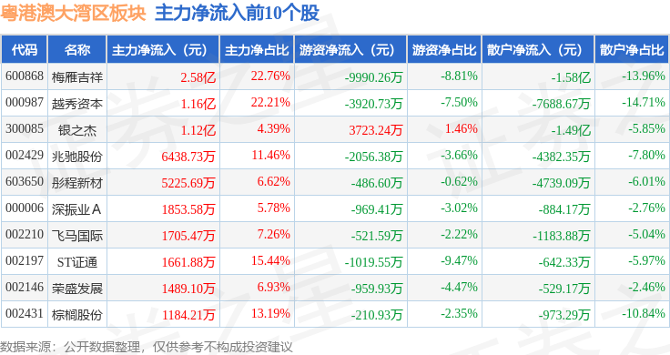 从资金流向上来看,当日粤港澳大湾区板块主力资金净流入3.33亿元,游资资金净流出9421.84万元,散户资金净流出2.39亿元。粤港澳大湾区板块个股资金流向见下表: