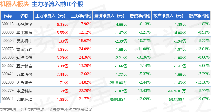 从资金流向上来看,当日机器人板块主力资金净流出11.09亿元,游资资金净流出19.93亿元,散户资金净流入31.02亿元。机器人板块个股资金流向见下表:
