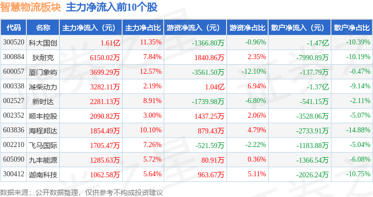 从资金流向上来看,当日智慧物流板块主力资金净流出2.49亿元,游资资金净流入6082.4万元,散户资金净流入1.88亿元。智慧物流板块个股资金流向见下表: