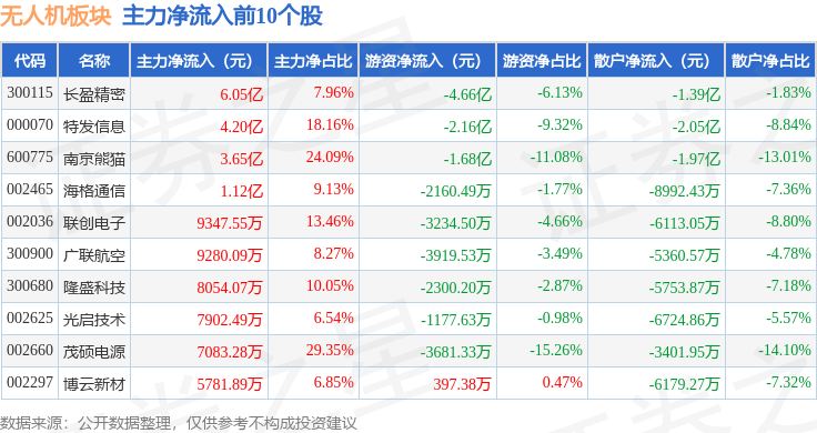 从资金流向上来看,当日无人机板块主力资金净流入3.31亿元,游资资金净流出8.53亿元,散户资金净流入5.22亿元。无人机板块个股资金流向见下表: