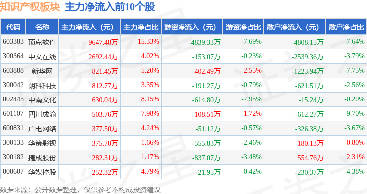 从资金流向上来看,当日知识产权板块主力资金净流出2.66亿元,游资资金净流出3677.81万元,散户资金净流入3.03亿元。知识产权板块个股资金流向见下表: