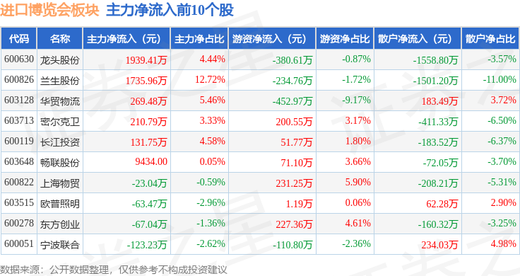 从资金流向上来看,当日进口博览会板块主力资金净流入2124.05万元,游资资金净流出302.58万元,散户资金净流出1821.47万元。进口博览会板块个股资金流向见下表:
