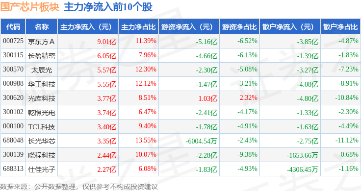 从资金流向上来看,当日国产芯片板块主力资金净流出10.59亿元,游资资金净流出9.83亿元,散户资金净流入20.42亿元。国产芯片板块个股资金流向见下表: