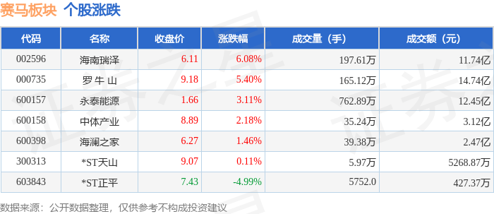 证券之星消息,12月5日赛马板块较上一交易日下跌0.73%,*ST正平领跌。当日上证指数报收于3902.81,上涨0.7%。深证成指报收于13147.68,上涨1.08%。赛马板块个股涨跌见下表: