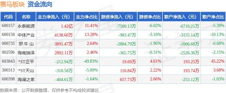 从资金流向上来看,当日赛马板块主力资金净流入2.42亿元,游资资金净流出1.09亿元,散户资金净流出1.33亿元。赛马板块个股资金流向见下表: