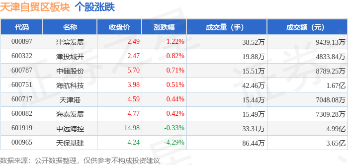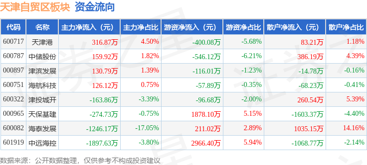 从资金流向上来看,当日天津自贸区板块主力资金净流出2848.68万元,游资资金净流入3838.74万元,散户资金净流出990.06万元。天津自贸区板块个股资金流向见下表: