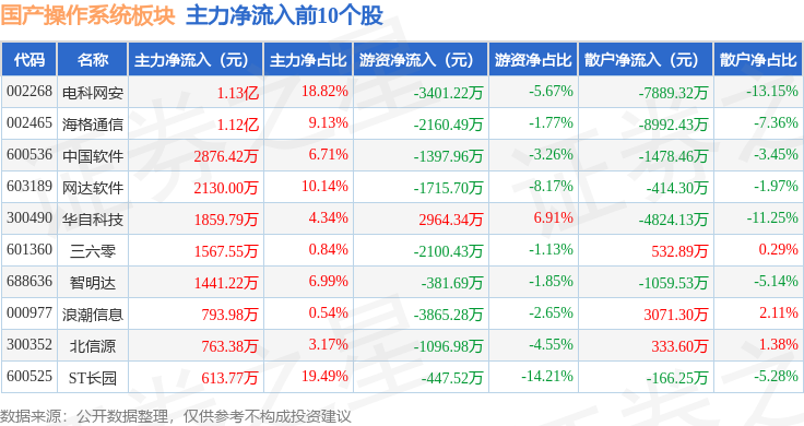 从资金流向上来看,当日国产操作系统板块主力资金净流出12.86亿元,游资资金净流入2.06亿元,散户资金净流入10.8亿元。国产操作系统板块个股资金流向见下表: