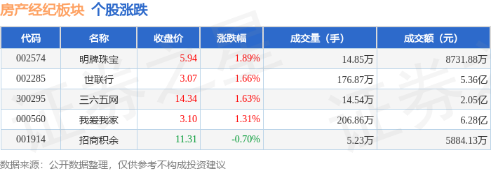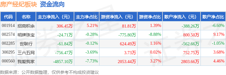 从资金流向上来看,当日房产经纪板块主力资金净流出5393.67万元,游资资金净流入1987.68万元,散户资金净流入3405.99万元。房产经纪板块个股资金流向见下表: