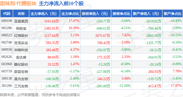 从资金流向上来看,当日甜味剂/代糖板块主力资金净流出6424.63万元,游资资金净流入9211.22万元,散户资金净流出2786.59万元。甜味剂/代糖板块个股资金流向见下表: