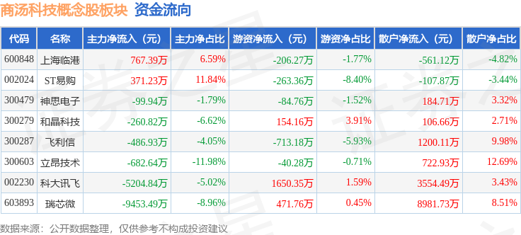 从资金流向上来看,当日商汤科技概念股板块主力资金净流出1.51亿元,游资资金净流入968.42万元,散户资金净流入1.41亿元。商汤科技概念股板块个股资金流向见下表:
