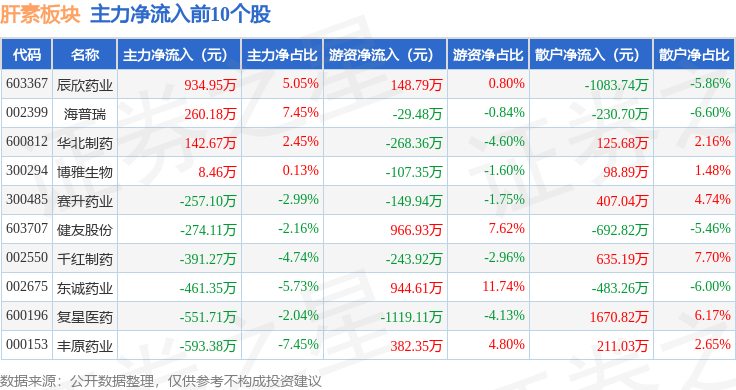 从资金流向上来看,当日肝素板块主力资金净流出1.87亿元,游资资金净流入7987.52万元,散户资金净流入1.07亿元。肝素板块个股资金流向见下表: