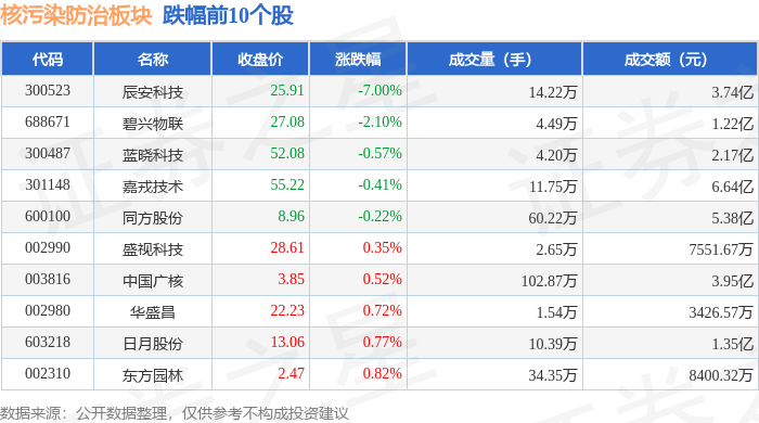 证券之星消息,12月5日核污染防治板块较上一交易日上涨0.94%,航天晨光领涨。当日上证指数报收于3902.81,上涨0.7%。深证成指报收于13147.68,上涨1.08%。核污染防治板块个股涨跌见下表: