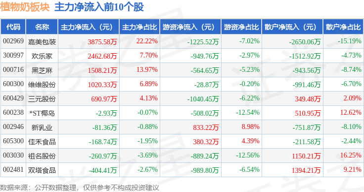 从资金流向上来看,当日植物奶板块主力资金净流出5950.4万元,游资资金净流入304.09万元,散户资金净流入5646.31万元。植物奶板块个股资金流向见下表: