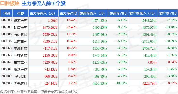 从资金流向上来看,当日口腔板块主力资金净流入3086.19万元,游资资金净流出1.53亿元,散户资金净流入1.22亿元。口腔板块个股资金流向见下表: