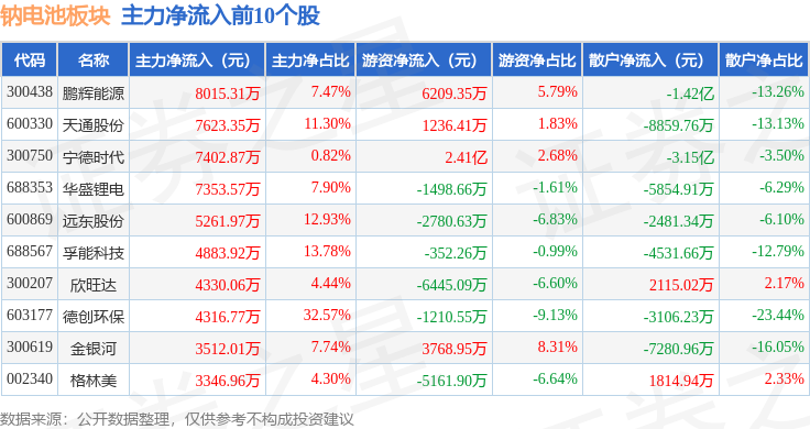 从资金流向上来看,当日钠电池板块主力资金净流出10.26亿元,游资资金净流出1.77亿元,散户资金净流入12.03亿元。钠电池板块个股资金流向见下表:
