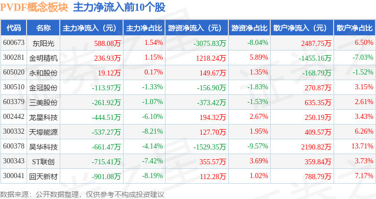 从资金流向上来看,当日PVDF概念板块主力资金净流出6.21亿元,游资资金净流出7563.79万元,散户资金净流入6.96亿元。PVDF概念板块个股资金流向见下表: