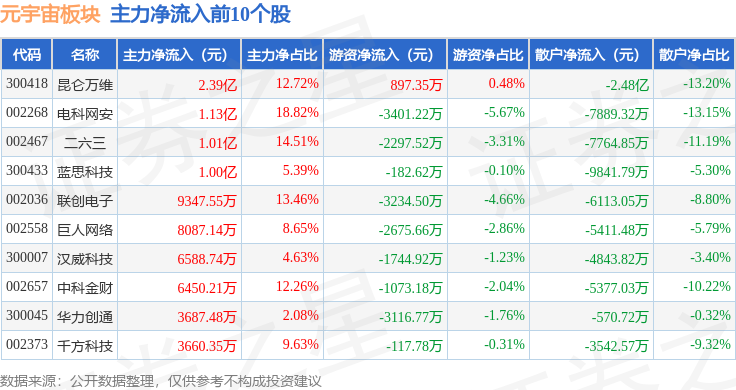 从资金流向上来看,当日元宇宙板块主力资金净流出6.8亿元,游资资金净流出4.34亿元,散户资金净流入11.14亿元。元宇宙板块个股资金流向见下表: