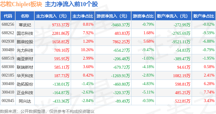 从资金流向上来看,当日芯粒Chiplet板块主力资金净流出5.62亿元,游资资金净流入2421.71万元,散户资金净流入5.38亿元。芯粒Chiplet板块个股资金流向见下表: