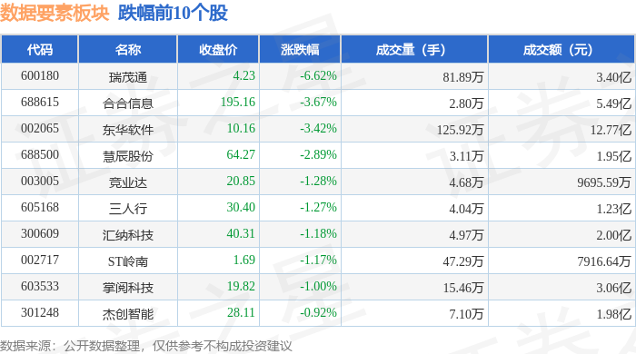 证券之星消息,12月5日数据要素板块较上一交易日下跌1.51%,瑞茂通领跌。当日上证指数报收于3902.81,上涨0.7%。深证成指报收于13147.68,上涨1.08%。数据要素板块个股涨跌见下表: