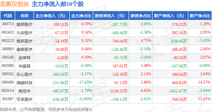从资金流向上来看,当日血氧仪板块主力资金净流出8978.78万元,游资资金净流入1371.91万元,散户资金净流入7606.87万元。血氧仪板块个股资金流向见下表: