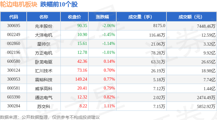 从资金流向上来看,当日轮边电机板块主力资金净流出2.61亿元,游资资金净流出1.01亿元,散户资金净流入3.62亿元。轮边电机板块个股资金流向见下表: