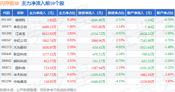 从资金流向上来看,当日闪存板块主力资金净流出10.26亿元,游资资金净流入4.6亿元,散户资金净流入5.66亿元。闪存板块个股资金流向见下表: