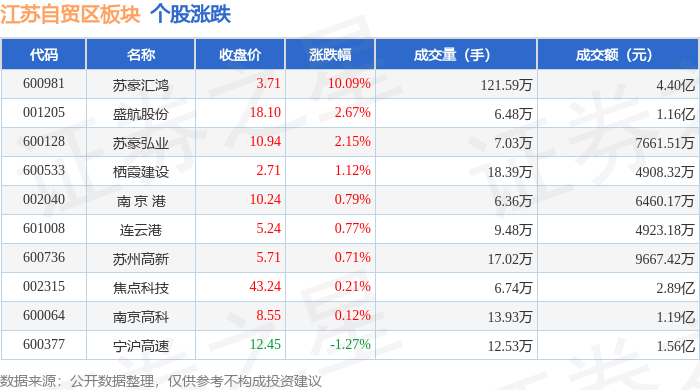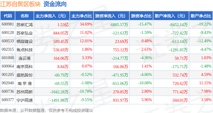从资金流向上来看,当日江苏自贸区板块主力资金净流入1.47亿元,游资资金净流出6116.47万元,散户资金净流出8619.72万元。江苏自贸区板块个股资金流向见下表: