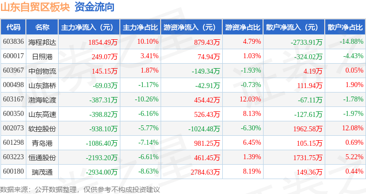 从资金流向上来看,当日山东自贸区板块主力资金净流出5758.15万元,游资资金净流入4945.82万元,散户资金净流入812.33万元。山东自贸区板块个股资金流向见下表: