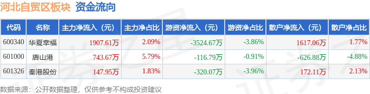 从资金流向上来看,当日河北自贸区板块主力资金净流入2799.24万元,游资资金净流出3961.53万元,散户资金净流入1162.29万元。河北自贸区板块个股资金流向见下表: