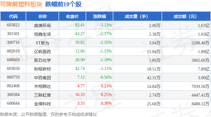 证券之星消息,12月5日可降解塑料板块较上一交易日上涨1.39%,双星新材领涨。当日上证指数报收于3902.81,上涨0.7%。深证成指报收于13147.68,上涨1.08%。可降解塑料板块个股涨跌见下表: