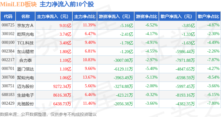 从资金流向上来看,当日MiniLED板块主力资金净流入17.07亿元,游资资金净流出11.56亿元,散户资金净流出5.51亿元。MiniLED板块个股资金流向见下表: