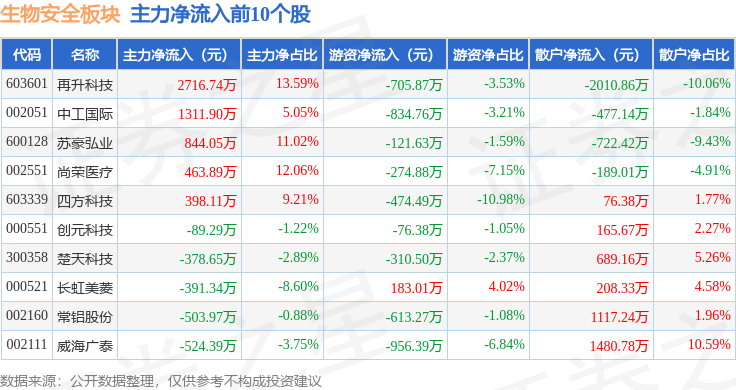 从资金流向上来看,当日生物安全板块主力资金净流出5632.25万元,游资资金净流出4720.99万元,散户资金净流入1.04亿元。生物安全板块个股资金流向见下表: