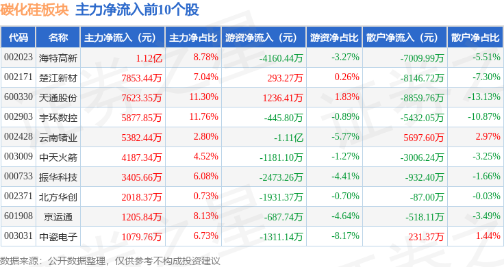 从资金流向上来看,当日碳化硅板块主力资金净流出6.8亿元,游资资金净流出6966.1万元,散户资金净流入7.49亿元。碳化硅板块个股资金流向见下表:
