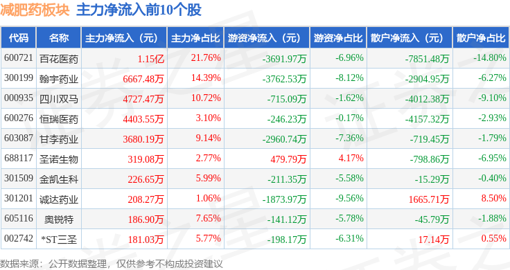 从资金流向上来看,当日减肥药板块主力资金净流出1.97亿元,游资资金净流出1.71亿元,散户资金净流入3.68亿元。减肥药板块个股资金流向见下表: