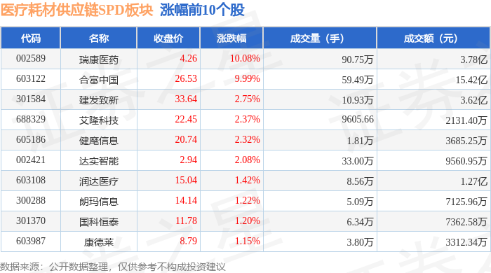 证券之星消息,12月5日医疗耗材供应链SPD板块较上一交易日上涨0.61%,瑞康医药领涨。当日上证指数报收于3902.81,上涨0.7%。深证成指报收于13147.68,上涨1.08%。医疗耗材供应链SPD板块个股涨跌见下表: