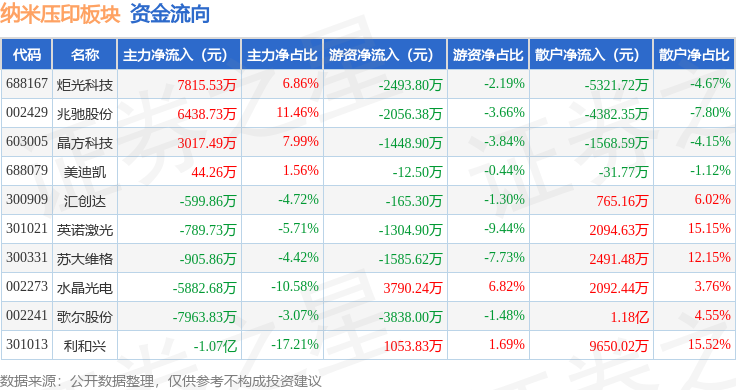 从资金流向上来看,当日纳米压印板块主力资金净流出9529.8万元,游资资金净流出8061.33万元,散户资金净流入1.76亿元。纳米压印板块个股资金流向见下表: