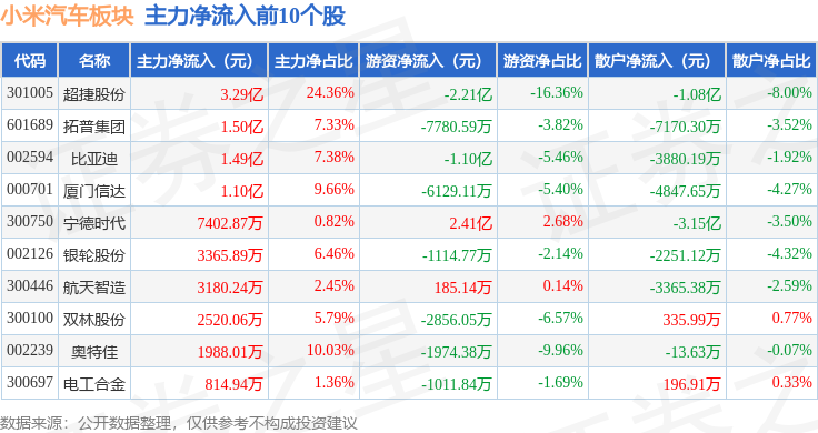 从资金流向上来看,当日小米汽车板块主力资金净流入4.7亿元,游资资金净流出3.4亿元,散户资金净流出1.3亿元。小米汽车板块个股资金流向见下表: