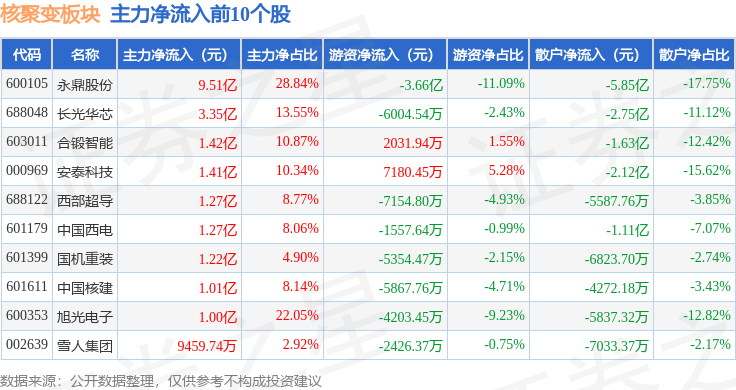 从资金流向上来看,当日核聚变板块主力资金净流入30.73亿元,游资资金净流出9.14亿元,散户资金净流出21.59亿元。核聚变板块个股资金流向见下表: