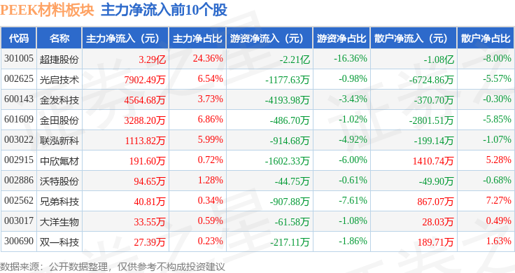 从资金流向上来看,当日PEEK材料板块主力资金净流入1.13亿元,游资资金净流出2.77亿元,散户资金净流入1.65亿元。PEEK材料板块个股资金流向见下表: