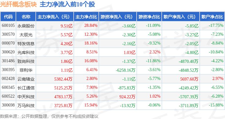 从资金流向上来看,当日光纤概念板块主力资金净流入28.72亿元,游资资金净流出11.39亿元,散户资金净流出17.33亿元。光纤概念板块个股资金流向见下表: